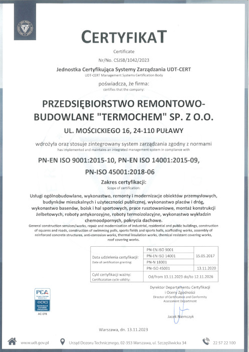 Działalność Przedsiębiorstwa Remontowo - Budowlanego TERMOCHEM Sp. z o.o. cechuje kompleksowy zakres usług budowlanych, nowoczesne technologie, wysokiej jakości materiały oraz najnowszej generacji park maszynowy. Dzięki zaangażowaniu wysoko wykwalifikowanej kadry specjalistów Spółka realizuje nawet najbardziej skomplikowane przedsięwzięcia budowlane.